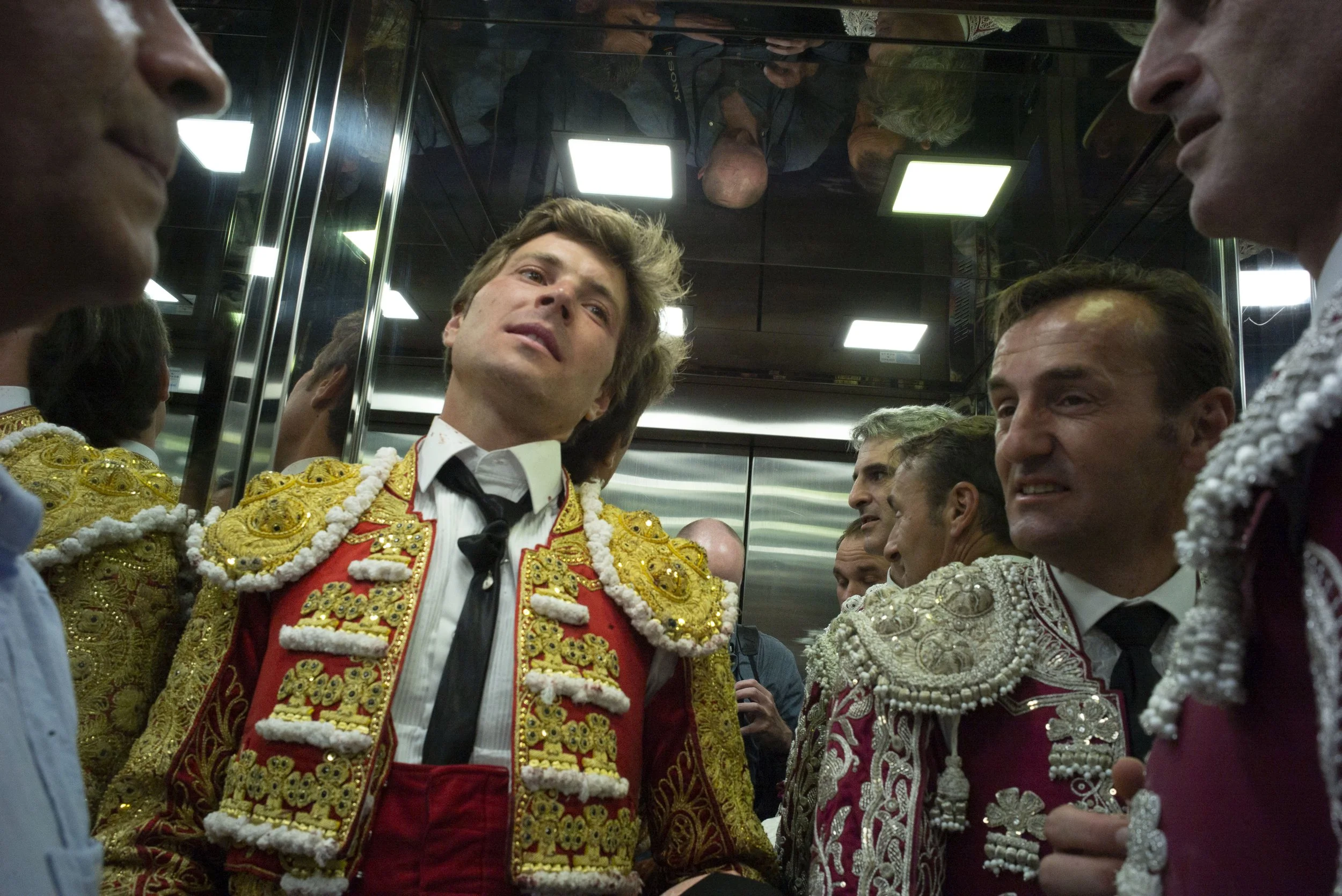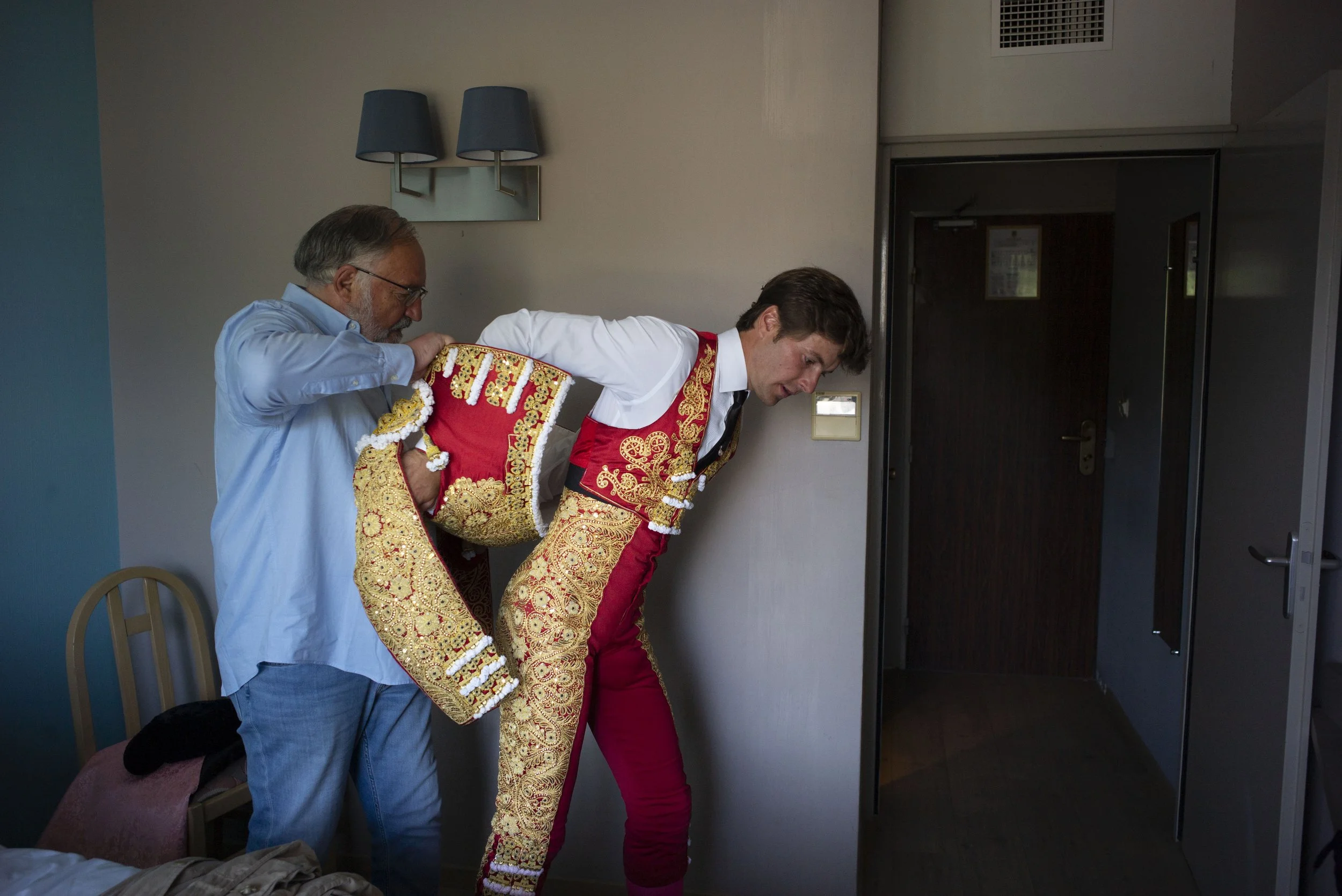 In his hotel room, Juan gets dressed in his ‘traje de luces’ (suit of lights) which will include his ‘chaquetilla’ - a heavily embroidered jacket, intricately hand-made with sequins, purl and silver or gold thread. The jacket can cost anywhere between €6,000 and €9,000 and can take an entire team of craftspeople months to make one jacket.
