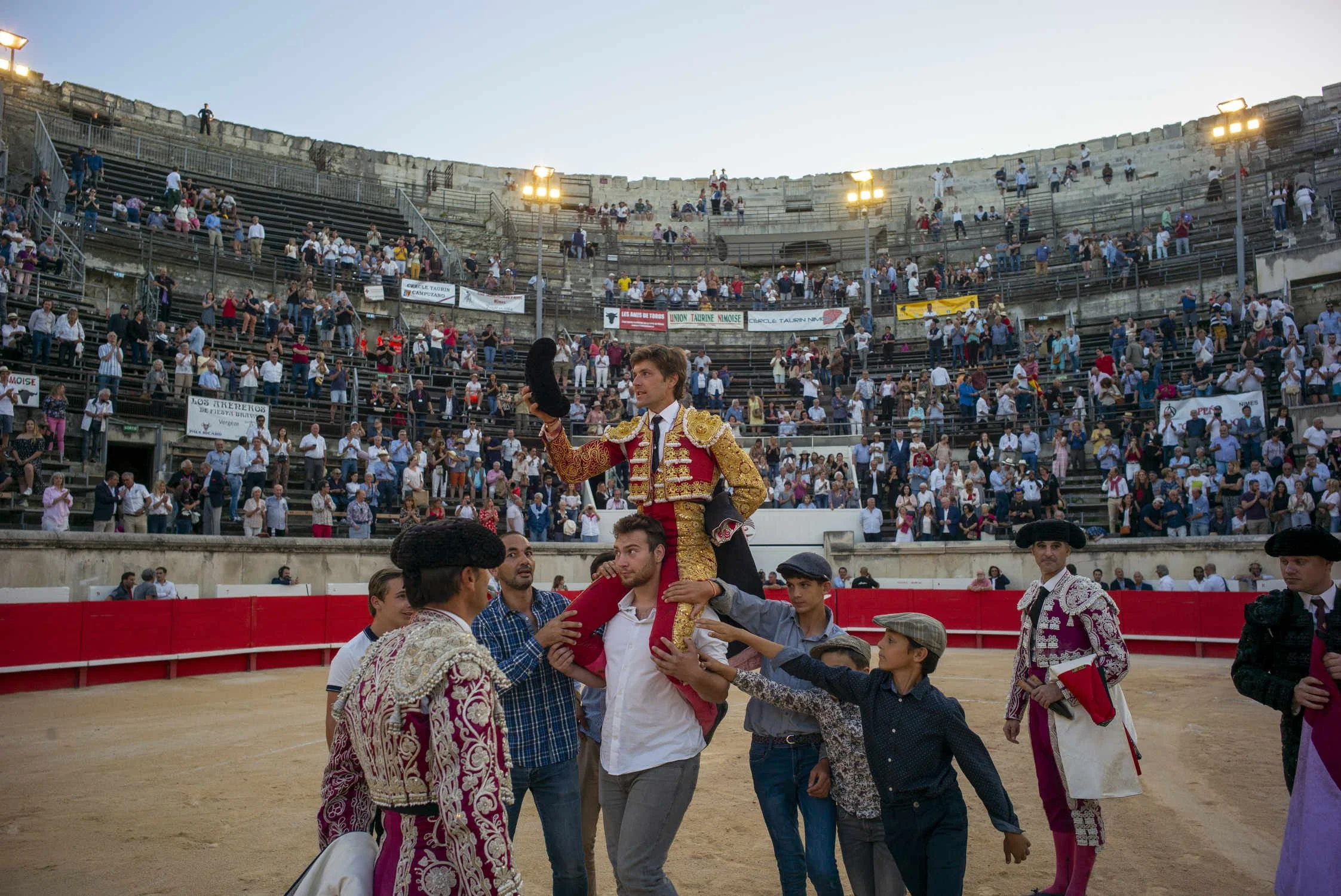 Juan Leal is paraded around Nimes stadium by his team and young supporters after being awarded champion over the other two matadors at the end of the day.