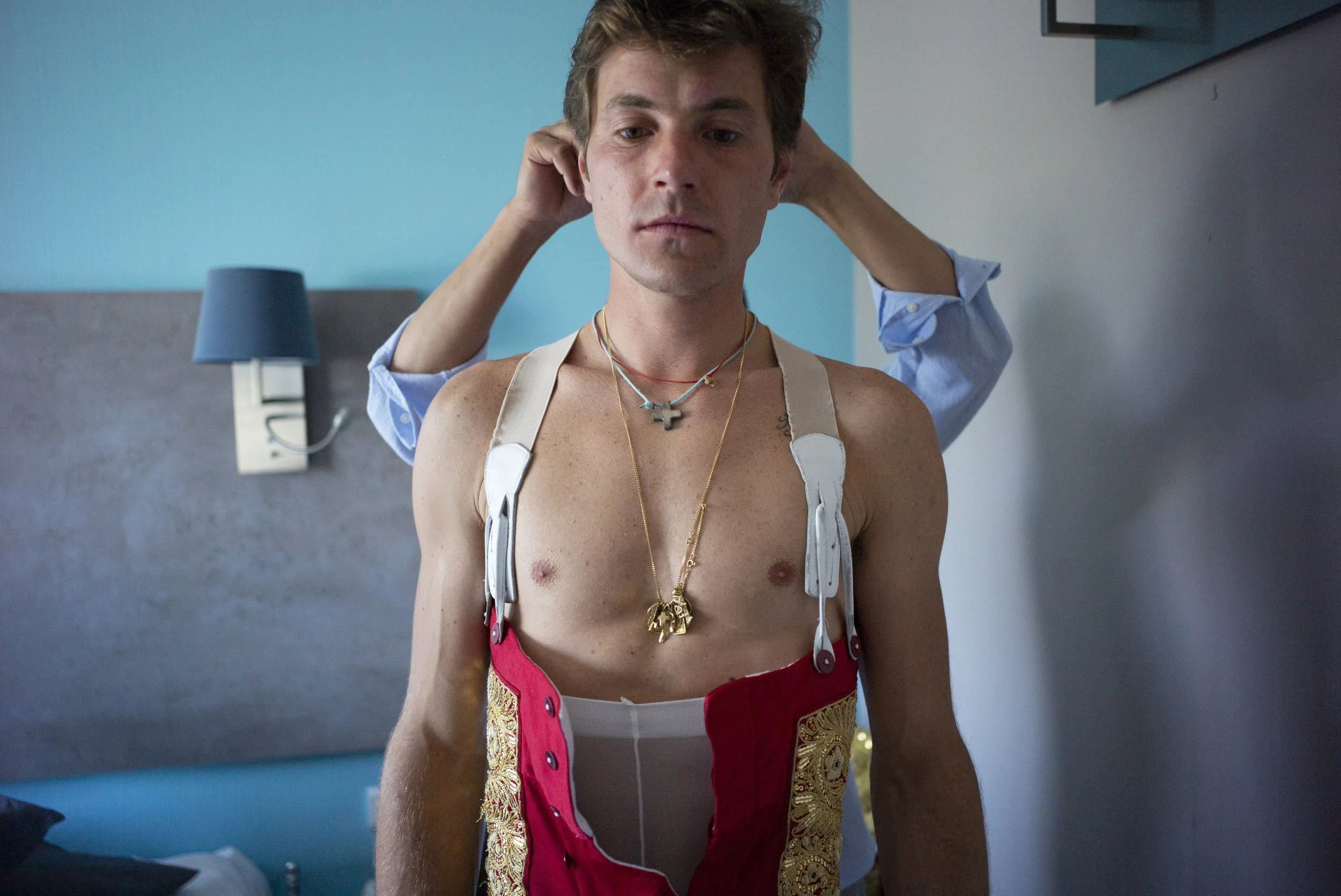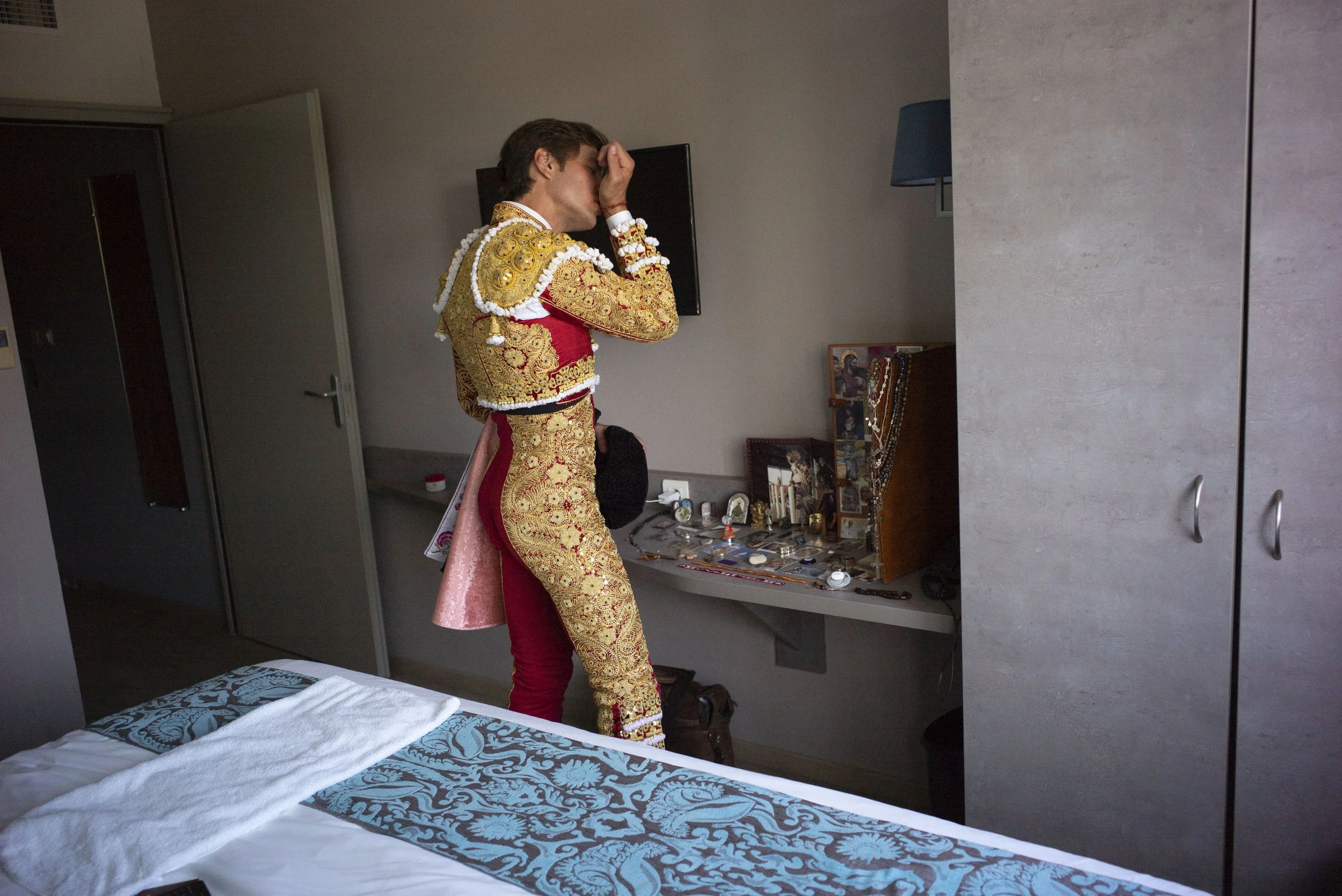 After practice Juan returns to his hotel room where he will get dressed before leaving for the arena. A matador and his team would spend a lot of time on the road, fighting in 50-60 corridas (bullfights) in a season. Once the season in Europe has ended, they then travel to South America, where they will perform another 50-60 corridas, totalling on average about 110 bullfights in one year. Juan had just driven nine and a half hours from Madrid, over night, so was without any sleep whatsoever.